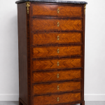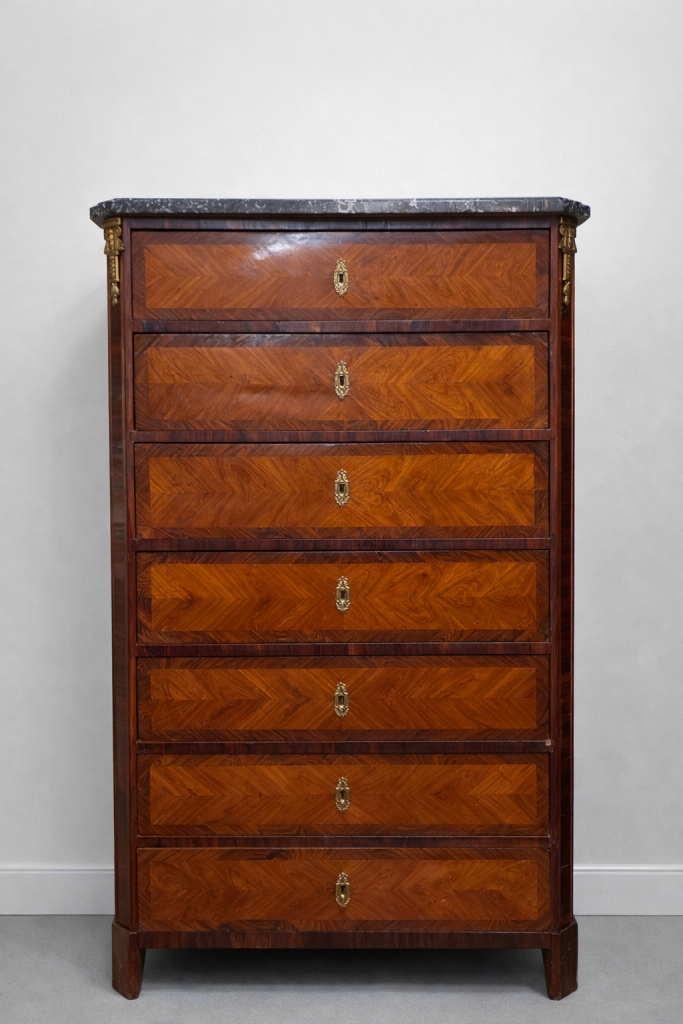 Elegante französische Kommode aus der Zeit um 1880. Fein furniert und traditionell mit Schellack handpoliert, wodurch die warme Holzmaserung besonders schön zur Geltung kommt.